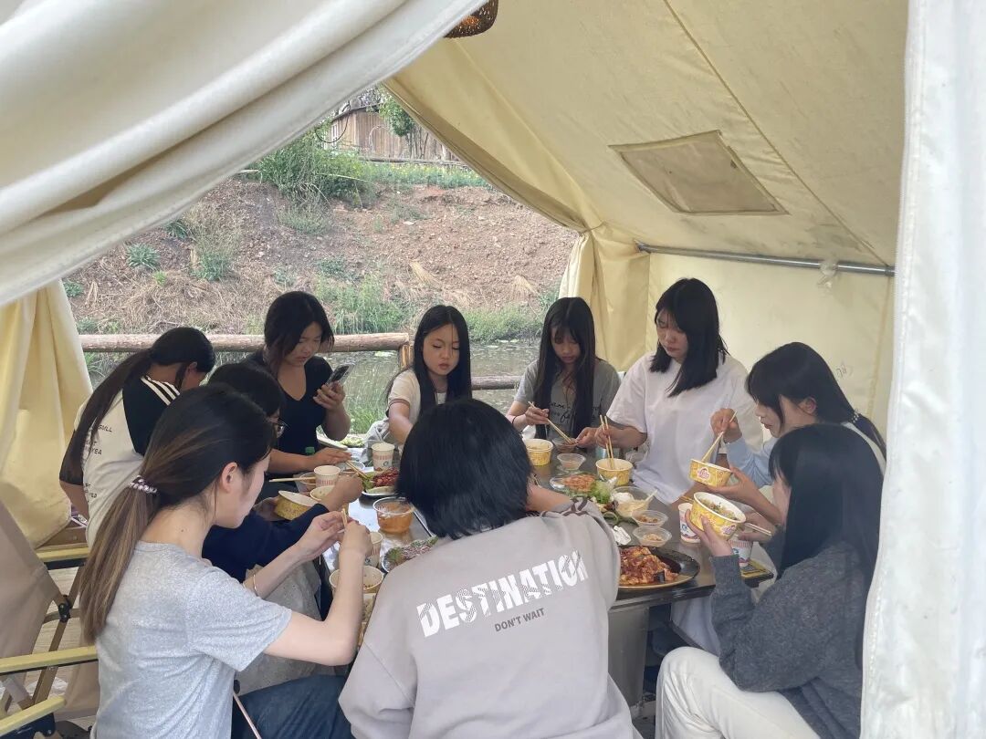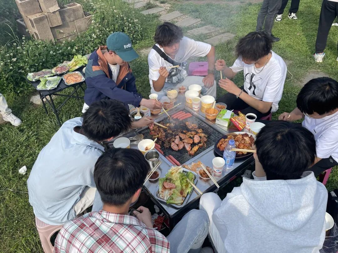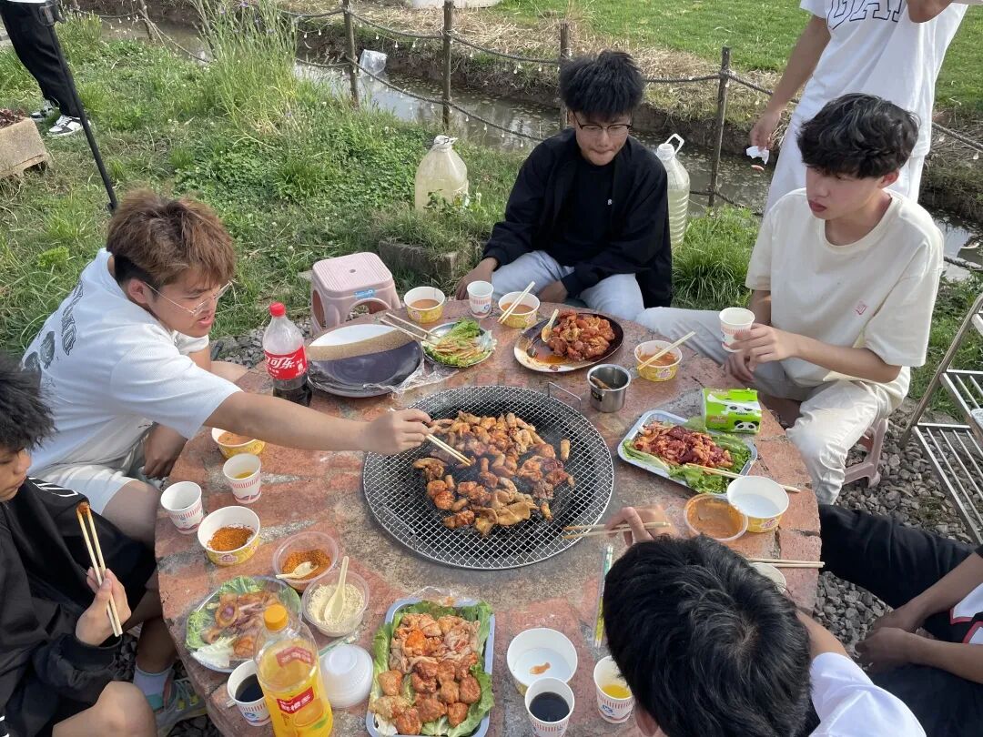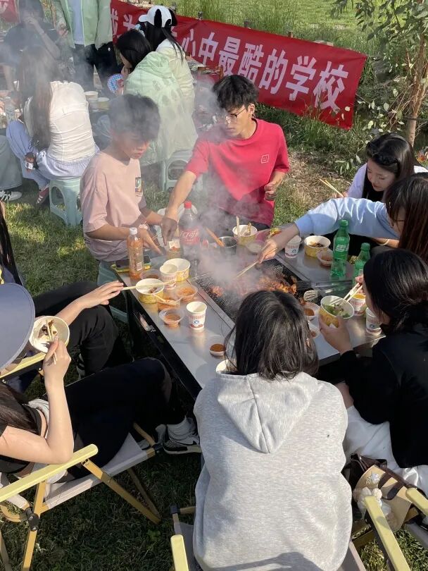 与此同时,烧烤区也热闹非凡,师生们分工协作,洗菜、穿串、生火、烤制,不一会儿,空气中便弥漫着阵阵香味,欢声笑语此起彼伏,大家共同分享着自己的劳动成果,感受着集体活动的温馨与快乐。