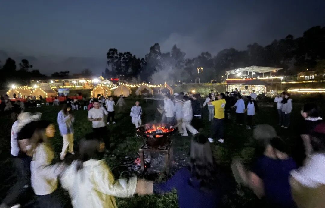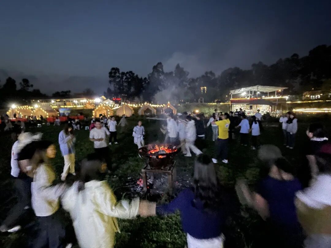 夜幕降临,篝火燃起,打歌舞表演正式开场! 随着极具节奏感的鼓点响起,身着民族服饰的师生们手拉手、肩并肩,围绕篝火跳起了欢快的舞步。
